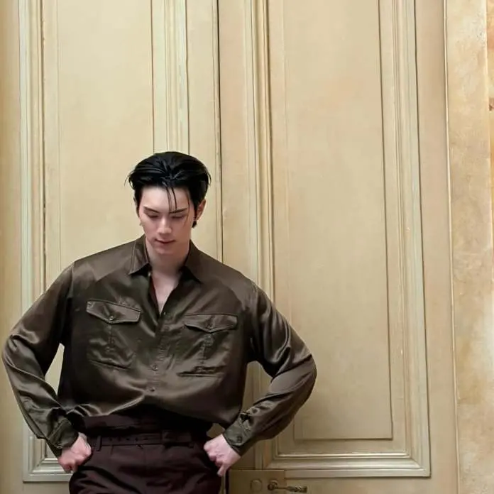 His slightly damp, styled hair and elongated silhouette added to the editorial feel, while the soft indoor lighting blended naturally with the warm tones of the room.